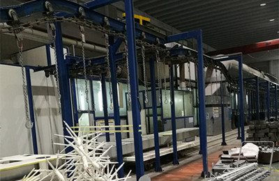 4、油漆(qī)塗裝生產線采用懸掛鏈與地(dì)鏈皮台車相結合的兩種輸送方式。懸掛鏈用於噴塗重量小於0.5噸(dūn)的工件,地鏈皮台車用於噴塗重量1噸以上的工件。兩種方式單獨運行。通過上件區、清理打磨式、水旋式噴漆室、流平室(shì)、烘幹室、下件區6個工位,完成了噴漆的完整係統循環。